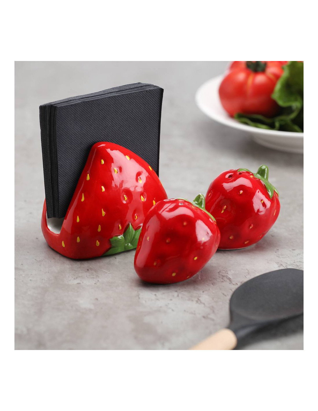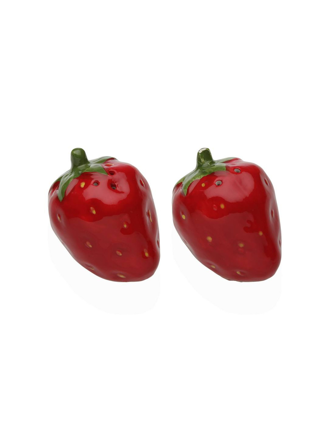 Il set sale e pepe fragola è un complemento da tavola allegro e decorativo, composto da due elementi in ceramica smaltata a forma di fragola con superficie lucida e dettagli curati. Ogni pezzo misura circa 6 cm di altezza e presenta fori sulla sommità per la distribuzione del contenuto: tre per il sale e due per il pepe. Il colore rosso brillante con puntini gialli e foglie verdi dona vivacità alla mise en place, rendendo questo set ideale per cucine colorate e ambienti dal gusto giocoso. Perfetto per contenere condimenti con stile, è anche una simpatica idea regalo per chi ama gli accessori originali e curati nei dettagli. Unisce funzionalità e fantasia, trasformando un gesto quotidiano in un momento di piacere visivo.