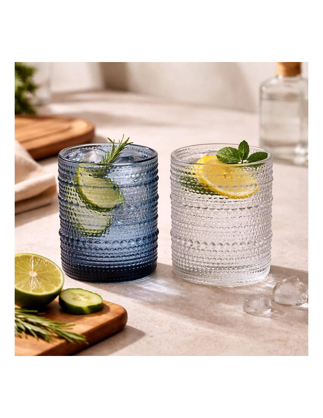 Il bicchiere blu Bollè conquista subito grazie alla sua tonalità intensa e alla lavorazione a rilievo composta da piccole bolle regolari che avvolgono l’intera superficie creando un effetto tattile e visivo di grande impatto. La forma cilindrica e il vetro spesso trasmettono solidità e qualità, rendendolo ideale per servire acqua, cocktail, succhi o bevande fresche con un tocco di stile contemporaneo. La texture puntinata riflette la luce in modo elegante, aggiungendo carattere alla tavola e valorizzando ogni momento di utilizzo. Perfetto per chi cerca un accessorio moderno e distintivo, capace di unire estetica, praticità e personalità in un unico elemento.