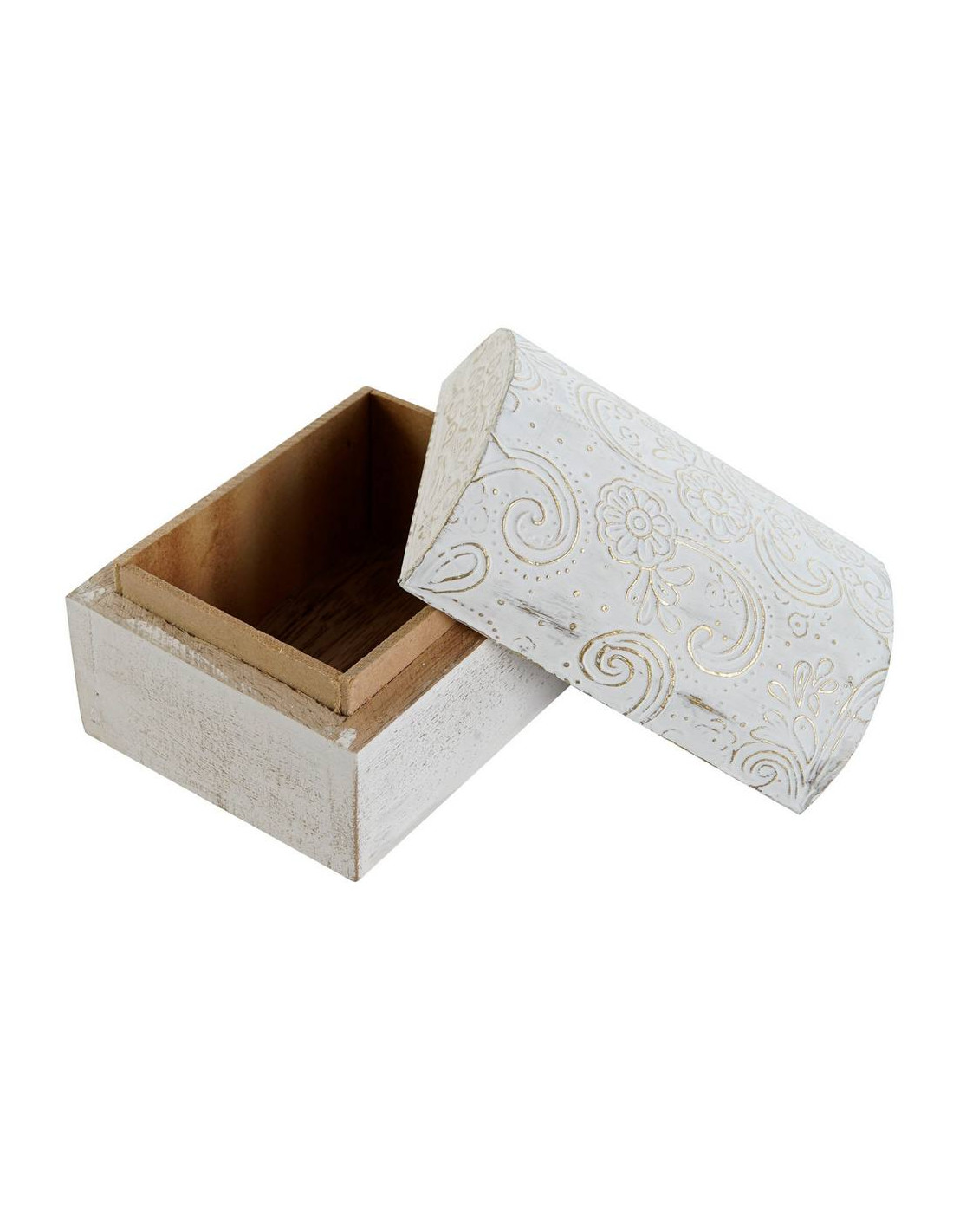 Scopri la fusione tra funzionalità ed estetica con la nostra collezione di scatole rettangolari bombate. Realizzate con cura utilizzando legno di mango di alta qualità, queste scatole presentano un coperchio in legno rivestito di rame sbiancato con incisioni delicate che aggiungono un tocco di classe. Disponibili in due diverse dimensioni per adattarsi alle tue esigenze specifiche: la più grande misura 10,5x8 cm con un’altezza di 8 cm. Ogni pezzo presenta due diversi motivi incisi che aggiungono un tocco personale ed elegante a qualsiasi ambiente della tua casa. Che tu desideri organizzare piccoli oggetti o semplicemente arricchire il tuo spazio con un oggetto d’arte funzionale e sofisticato, queste scatole sono l’ideale per chi cerca uno stile rustico ma raffinato.