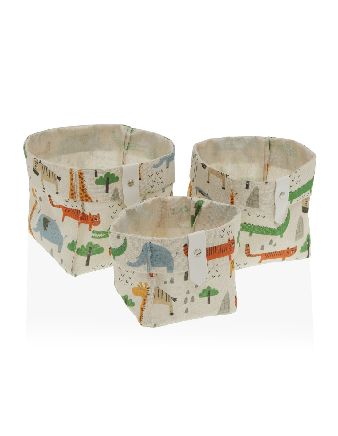 Trasforma la cameretta dei tuoi bambini in un'avventura nella savana con il set di 3 ceste quadrate Safari. Questi adorabili contenitori, realizzati in resistente poliestere beige e decorati con un vivace motivo safari, sono la soluzione ideale per tenere in ordine giocattoli, libri e vestitini con un tocco di allegria. Il set include tre ceste di dimensioni diverse, pensate per adattarsi a ogni spazio e necessità: la cesta grande misura 14x14x14 cm, la media 12x12x12 cm e la piccola 10x10x10 cm. Perfette per organizzare mensole, armadi o angoli gioco, queste ceste non solo aiutano a mantenere la stanza ordinata, ma stimolano anche la fantasia dei più piccoli grazie ai simpatici animali della savana raffigurati. Il loro design tenero e colorato le rende un elemento d'arredo perfetto per la cameretta, aggiungendo un tocco giocoso e funzionale. Scegli il set di ceste quadrate Safari per un ambiente ordinato, allegro e pieno di avventure.