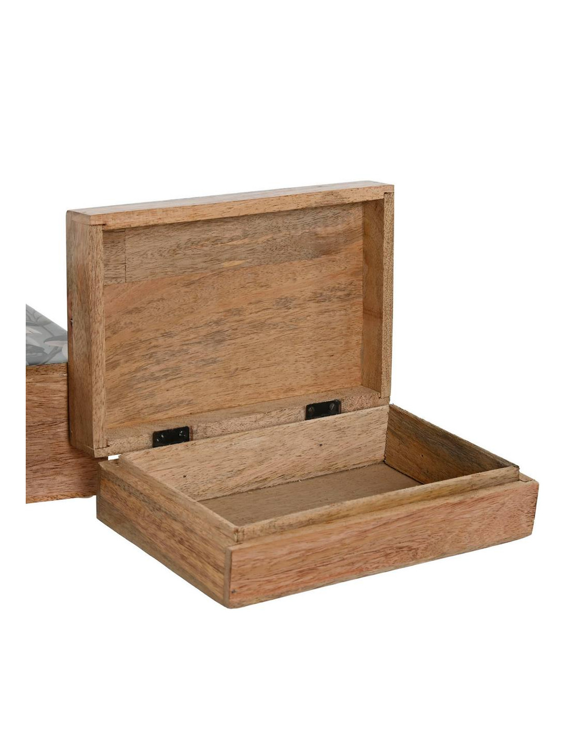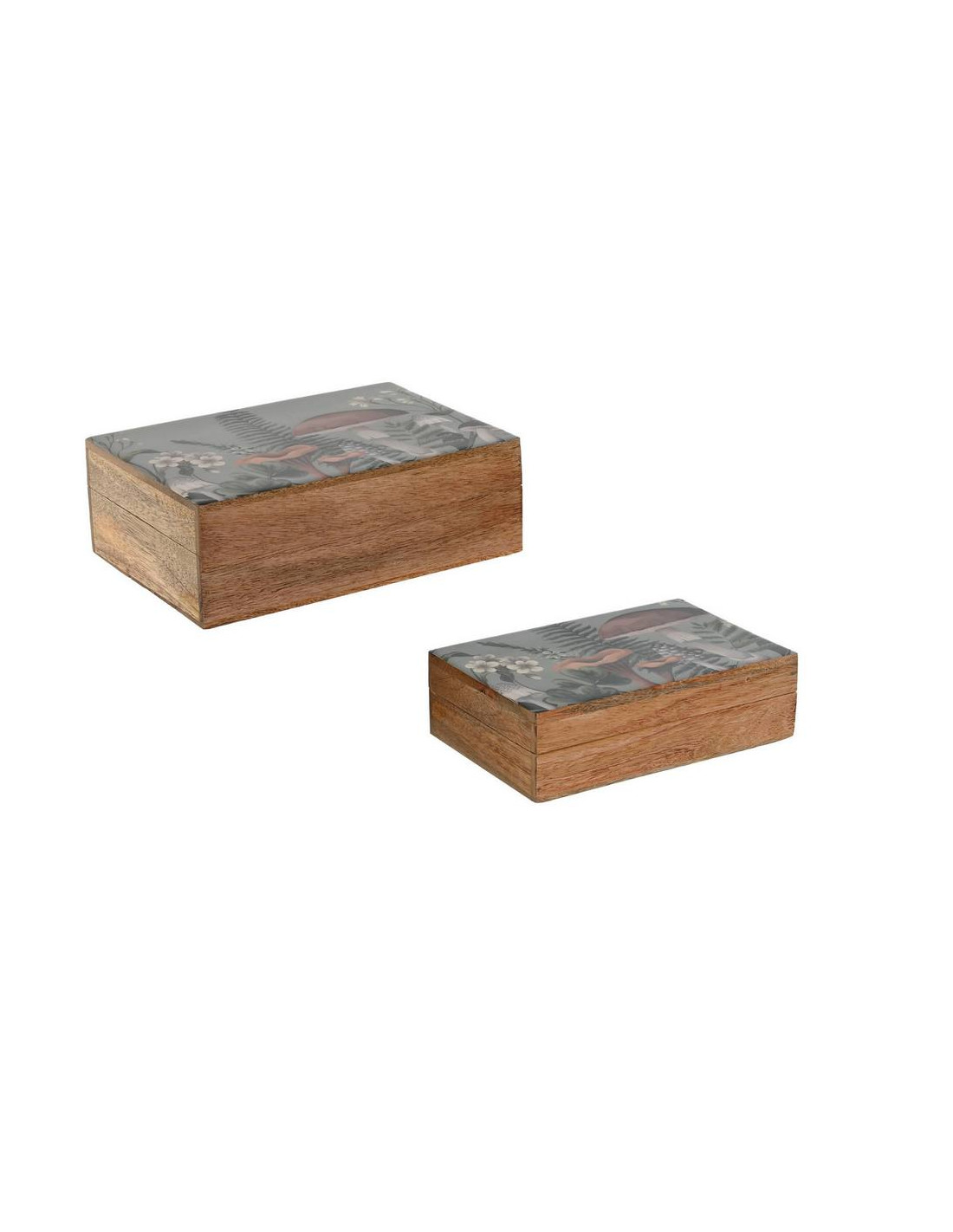 Organizza i tuoi spazi con un tocco di originalità e colore grazie a questo set di due scatole in legno. Il corpo delle scatole presenta una calda tonalità naturale del legno, mentre il coperchio è laccato in un vivace blu e decorato con un'affascinante fantasia a tema funghi con dettagli di uccelli e fiori in tonalità di rosso, grigio e bianco. Questo set è perfetto per riporre piccoli oggetti, documenti o accessori con stile. La scatola più grande ha dimensioni di 25,5 centimetri di lunghezza per 18 centimetri di larghezza e un'altezza di 8 centimetri, offrendo uno spazio contenitivo pratico e funzionale. La scatola più piccola, pur mantenendo lo stesso design accattivante, si adatta perfettamente a contenere oggetti di dimensioni inferiori. Aggiungi un elemento decorativo e funzionale alla tua casa con questo set di scatole dal design unico e ricercato.
