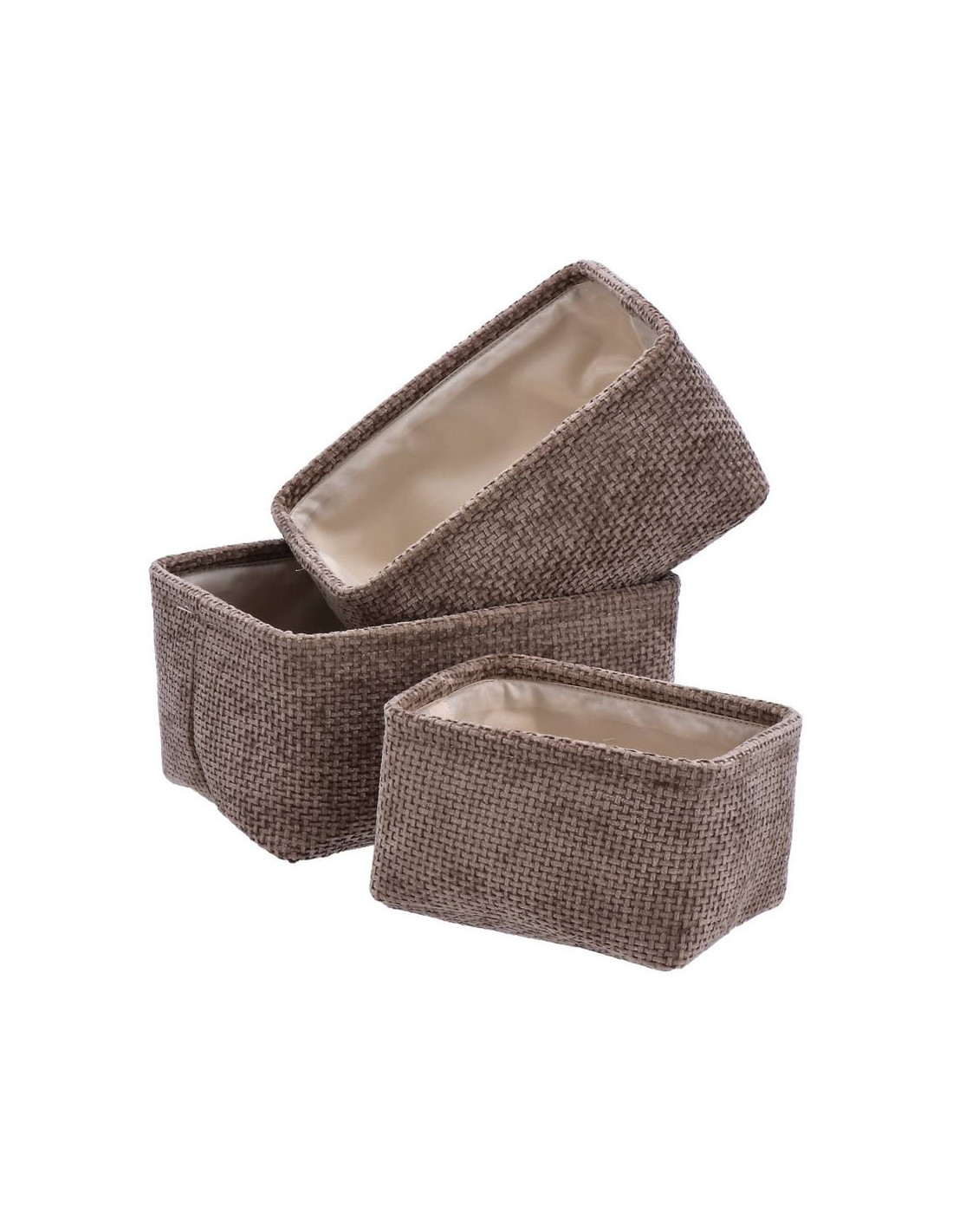 Cerchi una soluzione di stile per l'organizzazione della tua casa? Il cestino rettangolare JENNY è la risposta alle tue esigenze. Con un design pulito e moderno, si integra perfettamente in ogni ambiente, dall'ufficio al soggiorno, dalla camera da letto al bagno. È realizzato in tessuto di alta qualità con una robusta fodera interna, combinando così funzionalità e un'estetica raffinata. La sua forma rettangolare ti permette di ottimizzare lo spazio in cassetti e armadi, mentre la texture materica aggiunge un tocco di calore e design al tuo arredamento. La collezione è disponibile in tre bellissimi colori, come mostrato nell'immagine: un elegante bianco panna, un sofisticato rosa antico e un caldo marrone taupe, permettendoti di scegliere la tonalità che meglio si abbina al tuo stile. Per ogni esigenza di spazio, puoi scegliere tra tre misure: la misura S 20,5x15,5cm con altezza 11,5cm, la misura M 26x19cm con un'altezza 14cm, e la misura L 27,5x20,5cm con un'altezza 15cm. Scegliendo il cestino rettangolare JENNY, non acquisti solo un contenitore, ma un alleato indispensabile per rendere la tua casa più ordinata, armoniosa e accogliente.