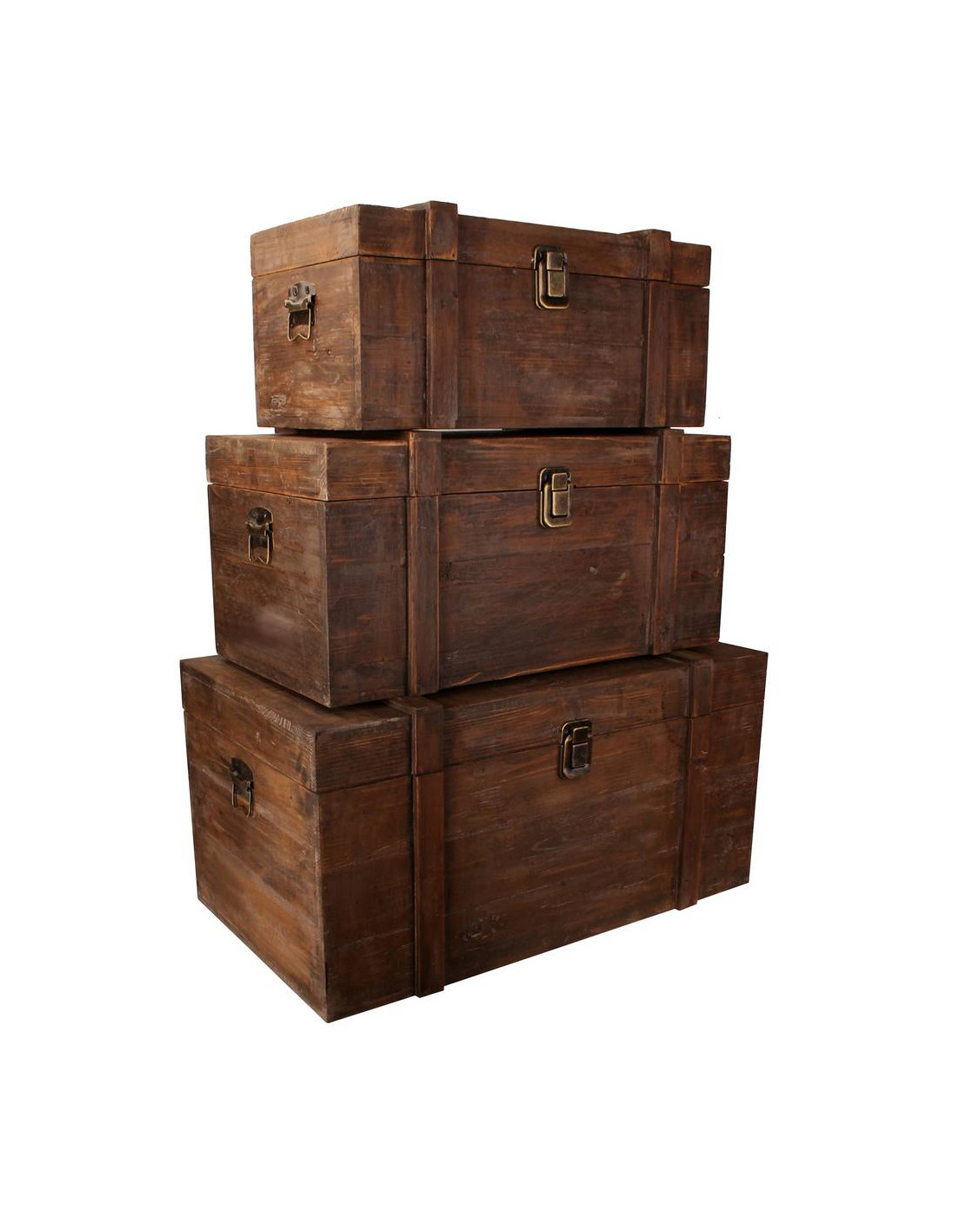 Set 3 bauli in legno vintage h.28/33,5/41cm con chiusure in metallo