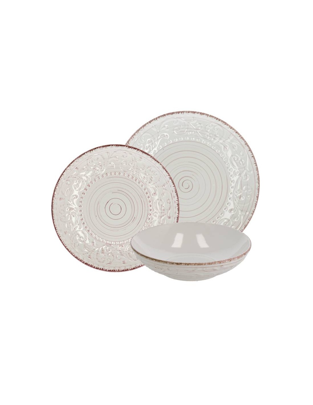 18 pezzi composti da 6 piatti fondi, 6 piatti frutta e 6 piatti piani