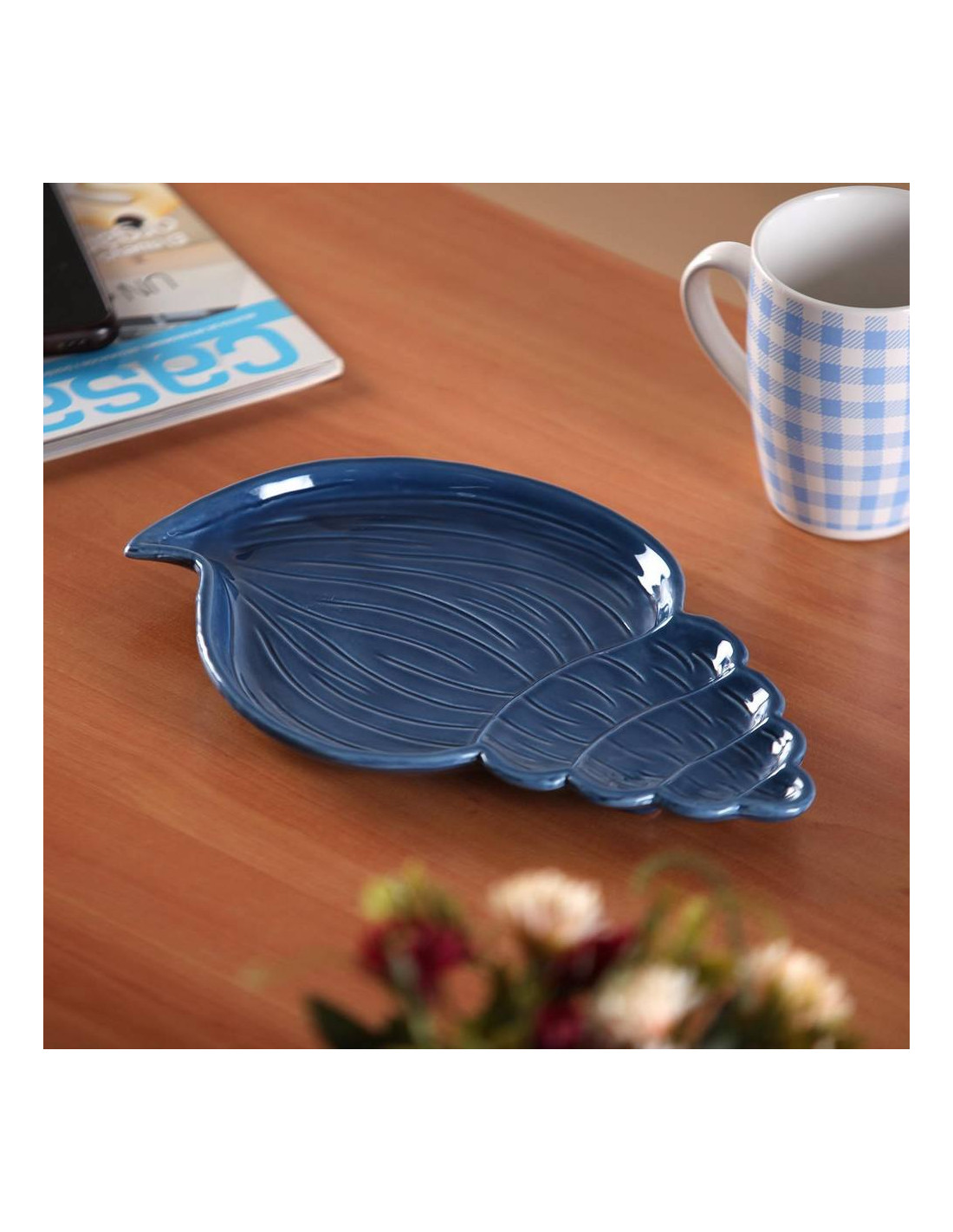 Immergi i tuoi ambienti in un'atmosfera costiera sofisticata con questa splendida decorazione a forma di conchiglia, realizzata in pregiata ceramica in una profonda tonalità blu navy dalla finitura lucida. L'oggetto si distingue per la meticolosa lavorazione delle scanalature e della spirale, che riproducono fedelmente le texture organiche dei tesori marini, creando eleganti riflessi sulla superficie brillante. Con una lunghezza di 26 centimetri, una larghezza di 13 centimetri e un'altezza di 3 centimetri, questo vassoio unisce perfettamente estetica e funzionalità. È ideale per essere utilizzato come raffinato svuotatasche in un ingresso, come elemento decorativo per il bagno o come centrotavola in una zona giorno dal sapore mediterraneo. La sua silhouette sinuosa e il colore intenso lo rendono un pezzo di grande carattere, capace di donare un tocco di design moderno e intramontabile a ogni superficie.